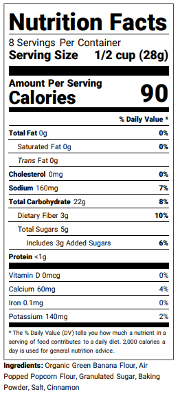 Sweet banana meets the rich crunch of popcorn flour. It’s tropical comfort with a bold, nutritious twist. Crafted with our patented Air-Popped Popcorn Flour—bold in flavor, rich in nutrients, and perfectly textured for every craving.