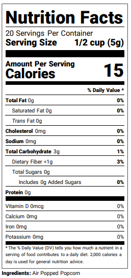 Air-popped popcorn flour is naturally high in dietary fiber, which supports digestion, helps regulate blood sugar, and keeps you feeling full longer. Unlike traditional refined flours that strip away the bran and germ, our flour retains the full nutritional profile of the kernel—offering essential B vitamins, antioxidants like polyphenols, and a satisfying crunch of clean energy.